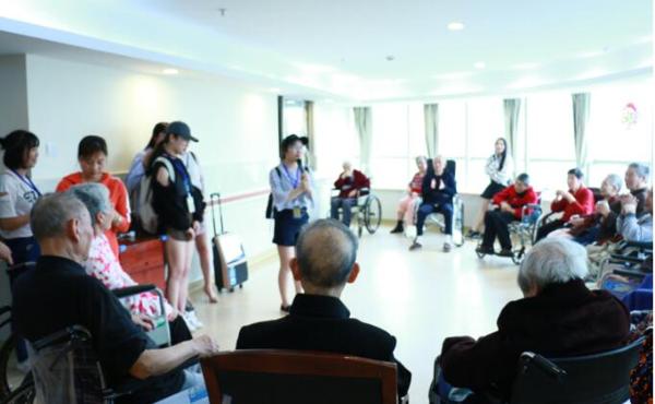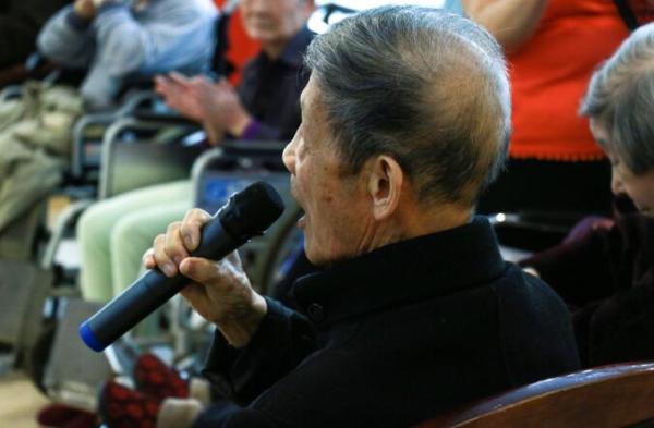 快乐粉丝会工作组于下午两点半将物资运送到福利院,三点钟与两个后援站的粉丝们集合完毕,搬完物资之后在工作人员的带领下来到老年康复护理院。正逢有老人们举办活动,工作人员请我们的粉丝上台为老人们表演节目。一位大四在读的白敬亭粉丝毫不怯场,给老人们带来了《东方红》、《咱当兵的人》,老人也跟着一同齐唱,气氛十分融洽。一位93岁的爷爷也主动拿起话筒,给大家演唱了《小白杨》、《康定情歌》,活力十足。节目结束,这位爷爷还背起了《桃花源记》、《五柳先生传》,很难想象一位93岁高龄的老人能够熟练背诵古文,还冒几句英文逗我们开心,临了走的时候还挥挥手说拜拜。