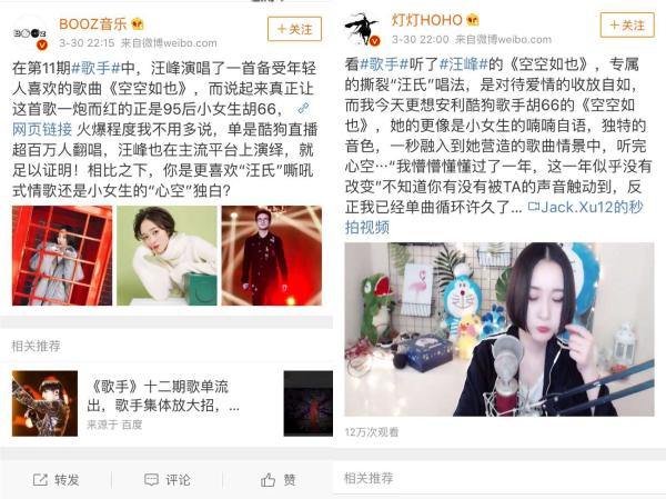 汪峰凭借胡66的《空空如也》,成功锁定总决赛席位,争夺本季歌王。节目播出后,不少知名音乐微博博主在介绍本期《歌手》时,纷纷提及到原唱胡66版本的《空空如也》。“汪峰演唱了一首备受年轻人喜欢的歌曲《空空如也》,而说起来真正让这首歌一炮而红的正式95后小女生胡66,火爆程度我不用多说,但是酷狗直播就超百万人翻唱。”