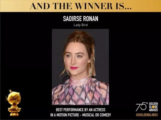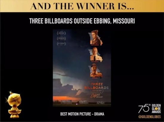 《三块广告牌》成为电影类奖项最大热门,夺得包括剧情类最佳电影在内的四项大奖。弗朗西斯・麦克道曼夺得剧情类最佳女主角,加里・奥德曼凭借《至暗时刻》中深入人心的丘吉尔形象获得剧情类最佳男主角;吉尔莫凭借今年威尼斯电影节大热电影《水之形》获得最佳导演奖;在国内票房和口碑双丰收的《寻梦环游记》毋庸置疑地夺得了最佳动画奖;德国电影《凭空而来》获得最佳外语片奖