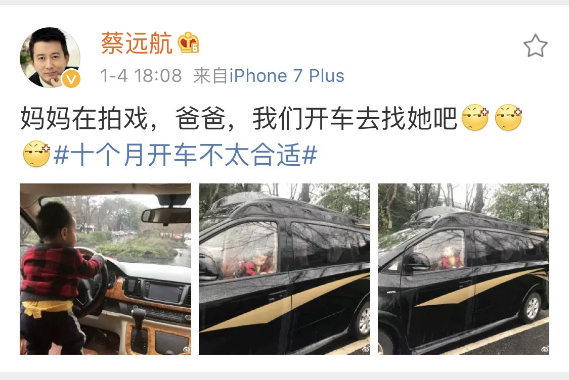 昨日,孙茜老公蔡远航以儿子蔡小宝口吻发博:“妈妈在拍戏,爸爸,我们开车去找她吧!”配图中,十个月大的蔡小宝手持方向盘一副驾驶员的架势,蔡远航也配上话题指称:“十个月开车不太合适”。网友被蔡小宝鬼灵精怪的萌态可爱到,纷纷表示:“宝贝儿太可爱啦!”