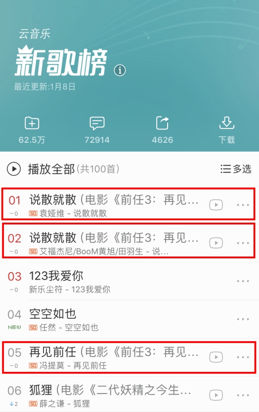 三首歌曲完全上线之后,自在天浩联合唱吧举办线上翻唱活动,联合抖音APP开展挑战活动,搭建微博新媒体话题页面增加歌曲话题度和讨论度,在音乐平台制作《前任攻略》系列电影主题专栏和“说散就散”主题歌单,从新媒体渠道全方位推进电影曝光度的持续走高。