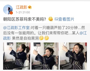 近日,江疏影工作室晒出几张江疏影美照,并开启吐槽模式“对着一只糖葫芦拍了20分钟,然后没有一张能用的……某人@江疏影 果然是自拍黑洞”,江疏影则现身“盗图”,放出自己的表情包与工作人员互怼,并自称“朝阳区苏菲玛索”,引发网友爆笑评论“啥都别说了,手机里的自拍放出来吧”。
