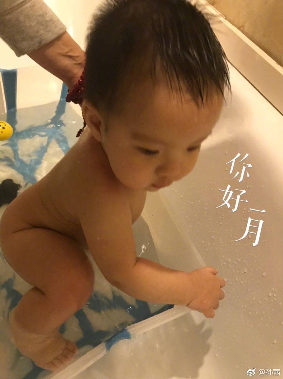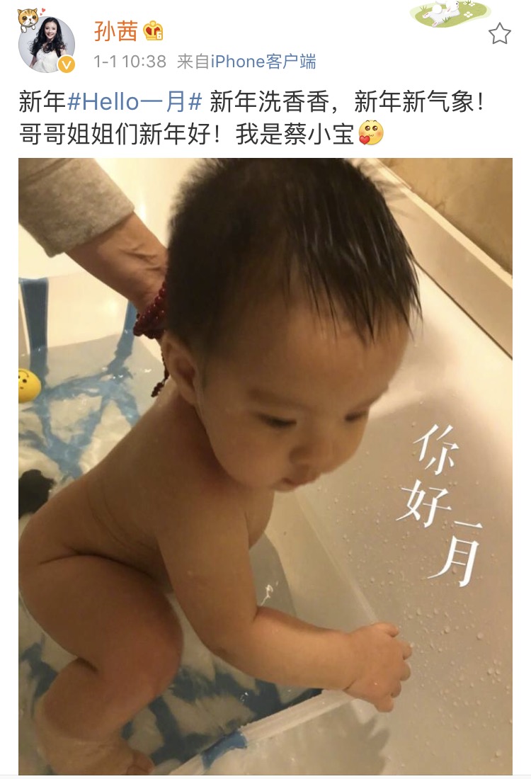新年第一天,孙茜微博晒出一张儿子蔡小宝洗澡时的照片并配文:“新年洗香香,新年新气象!哥哥姐姐们新年好!我是蔡小宝。”