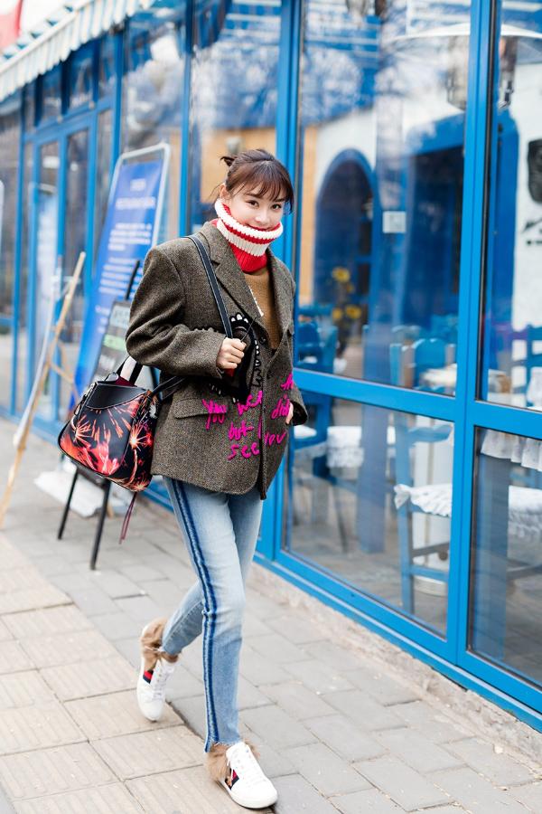 今日,袁姗姗一组时尚街拍大片曝光。绣字西装外套浪漫复古风,搭配烟花色彩单肩包,绚丽又时髦。