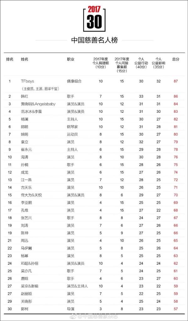 日前,由《中国慈善家》杂志评选的第五届“2017年中国慈善名人榜”火热揭晓!令人注意的是,Angelababy黄晓明夫妇在慈善事业持续发力,以84的总评分位列第三名。