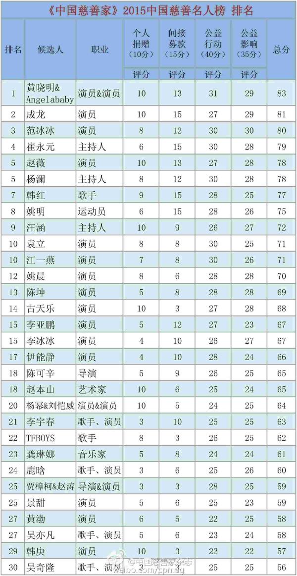 Angelababy黄晓明夫妇获2015年中国名人慈善榜榜首