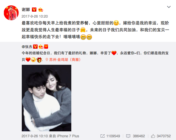 谢娜和张杰于2010年公开恋情,已经携手走过了八年之余。2011年9月26日,两人在云南迪庆州香格里拉举办婚礼,之后他们一直低调甜蜜地相守相伴。2017年9月26日,在结婚六周年纪念日之际两人公布怀孕的消息,让许多人为这对恩爱夫妻感到开心,纷纷送上祝福。