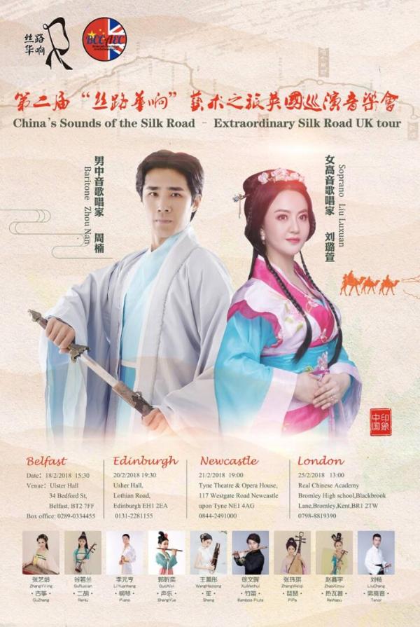 据主办方介绍,此次巡回音乐会将在春节期间英国四地进行巡回演出,分别为:2月18日贝尔法斯特歌剧院,2月20日爱丁堡亚瑟剧院、2月21日纽卡斯尔泰恩歌剧院,以上城市的巡演由英中文化艺术交流中心总策划,目的是弘扬中国传统文化, 贯彻一带一路的精神; 传播丝路文化的使命 – 让中国的声音响彻世界, 演出期间得到了Inveraray Castle 的大力支持. 在这三场演出期间得到了Inveraray Castle 的大力支持,最后在2月25日伦敦进行完美收官。值得一提的是,在2月25日伦敦这场收官音乐会中,丝路华响艺术团的青年艺术家将和伦敦瑞雅中文学校的小朋友共同表演。这场演出由旅英文化学会策划并且和瑞雅中文学校共同主办的纯公益性质的新年音乐会。主题是2018北京——伦敦,与孩子们共唱丝路之歌新春联欢会。大家会看到各种不同肤色的小朋友和丝路华响的艺术家们,一起演绎各种形式具有中国传统文化特色的音乐节目。
