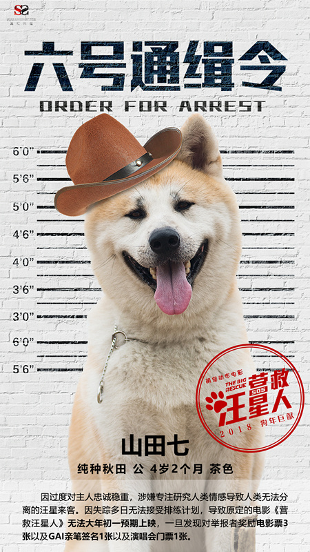 据悉,除了率先出镜的狗狗大雄,其他八大“通缉犯”也将陆续公布,它们分别是在片中本色出演的西伯利亚雪撬犬、英式博美、三条腿串串、大头法斗、纯种秋田、纯种比熊、马里努阿犬、美国恶霸犬。值得一提的是,效仿警方对通缉犯的有奖悬赏办法,出品方此次也对相关线索提供者发起重大奖励,据悉,数量不等的《营救汪星人》电影票,成毅、文松阿拉蕾的亲笔签名照,以及电影衍生产品如抱枕、茶杯,甚至演唱会门票等,出品方一律免费派送。