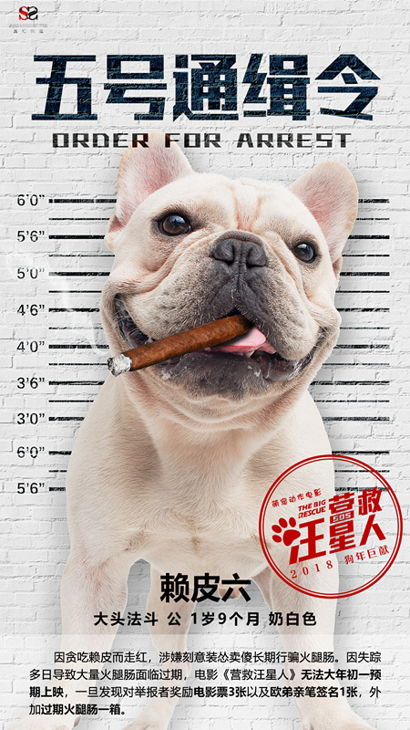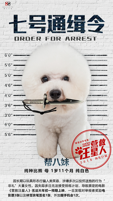 此外,记者获悉,这部由星汇天姬影视传媒出品,梁婷担任导演/编剧,成毅、阿拉蕾、文松、欧弟、林雪、李天佑、球球等联袂主演的萌宠动作电影《营救汪星人》今天重磅推出一系列创意海报。其中,九大“通缉犯”创意海报“有奖悬赏”受到广大影迷青睐。首款和大家见面“通缉犯”海报自然由主演“大雄”撑场。从曝光的画面看,温顺的拉布拉多的大雄摇身一变成了“刀疤脸”,身后是香港警匪电影通缉重犯时常用的背景板,气氛一片肃杀。通缉内容如下:“刀疤雄,纯种拉布拉多,公,2岁7个月,奶茶色。因过度善解人意警觉性较高,涉嫌假装聪明,导致人见人爱,智商排行榜有可疑迹象。因失踪多日无法接受排练计划,导致原定的电影《营救汪星人》无法大年初一预期上映。一旦发现对举报者……”