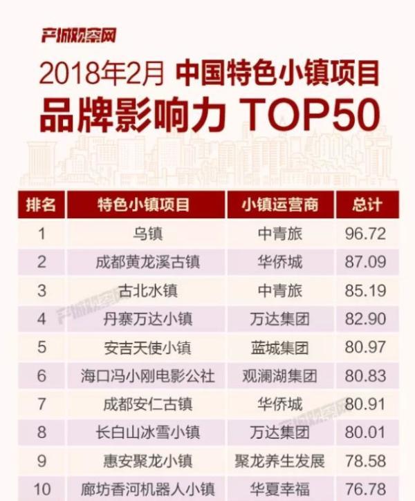 日前,产城观察网发布的《2018年2月中国特色小镇项目品牌影响力TOP50》榜单显示:受到中国2018年春节旅游热的影响,文旅类小镇热度持续升温。