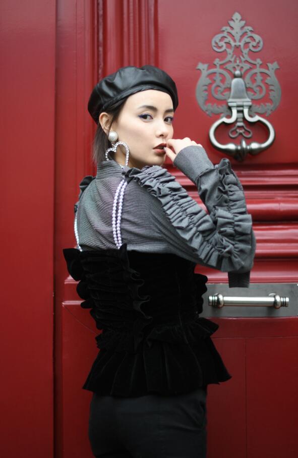 最近,时尚icon赵宇彤曝光一组巴黎的街拍照。照片中,赵宇彤内穿灰色衬衫高级大气,夸张的褶皱和袖口的飘带设计为衣服增添了许多活力。外搭珍珠吊带黑色胸衣,丝绒质地更显质感,抽带的收腰设计让她姣好的身材曲线展露无遗。贝雷帽活力俏皮,给整体look增添时尚感,银灰色尖头细高跟鞋恰到好处的打破环境的沉闷,脚踝处的毛边设计让人眼前一亮。手牵三只英伦范可爱狗狗,像极了英国午后优雅出街的贵族淑女。