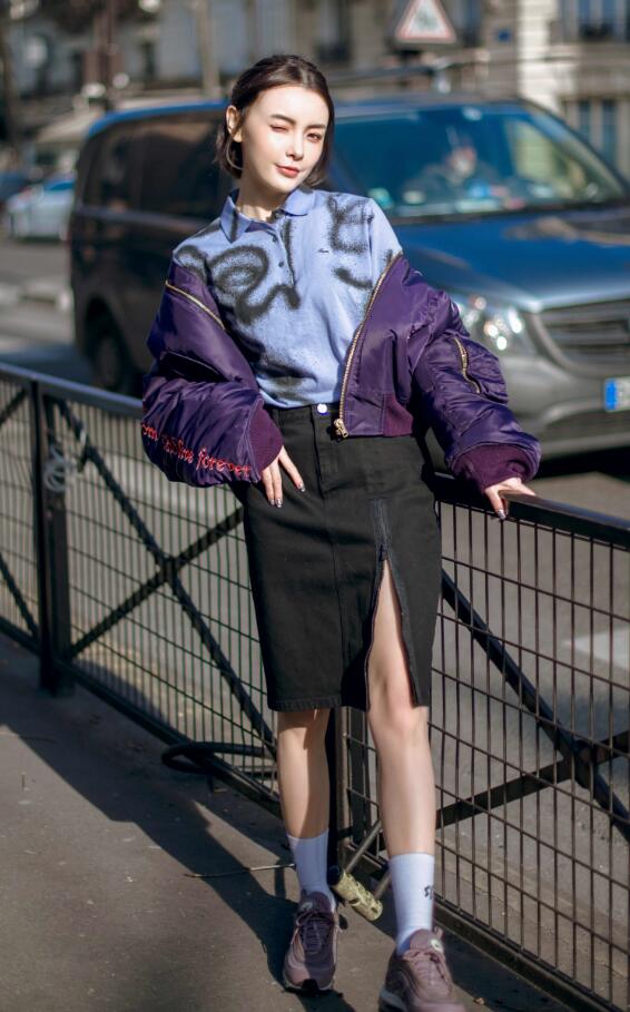 与在上一秀场的精致甜美的优雅形象不同,这次秀场上,赵宇彤以一身休闲、运动与优雅的混搭裙装造型亮相。当天,赵宇彤身穿该品牌最经典的标志单品Polo衫,混搭女人味十足的开叉铅笔裙,给人耳目一新的冲击感。蓝色Polo衫上行云流水的线条十分写意,与黑色OL风铅笔裙碰撞出别样的美感。18年最in流行色紫外光色棒球外套与脚上的紫色运动鞋相呼应,潮范十足。赵宇彤举手投足间透着不经意的时髦感,彰显出舒适、优雅的生活态度,也展现了“痞帅精灵”的时尚百变气质。