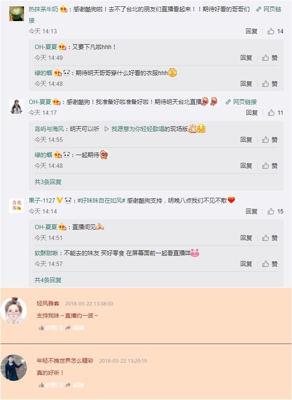 这个小心意现在被“乐人·live”捕捉到啦,作为腾讯音乐娱乐为乐迷们打造的原生态、零距离的超级音乐现场活动品牌,乐人·live不愿辜负每一位乐迷的期待。这场3月24日晚8点在台北的好妹妹演唱会,可以通过酷狗直播在线上同步观赏哦,酷狗官微和预约页面放出来后评论区都是各种期待,有好奇明天穿什么衣服的,有买零食的,更多是组队求约直播间见的,演唱会就应该一起看嘛!不能组队去现场,咱还有弹幕不是?