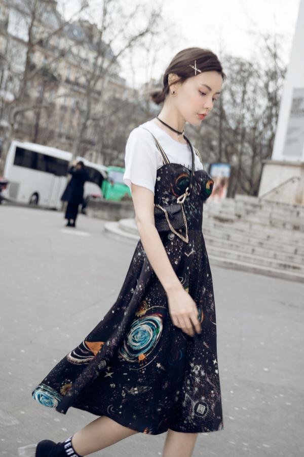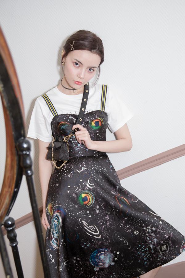近日,时尚icon赵宇彤曝出一组在巴黎最新拍摄的写真。照片中,赵宇彤将SHIATZY CHEN的白色卡通T恤与吊带连衣裙叠穿配搭,裙身印满了未来感十足的星球、飞碟、火箭元素,极为梦幻;清爽干练的短发扎起的小辫儿搭配小清新发夹,呆萌可爱年轻时尚;袜靴的配搭拉长小腿比例,整体青春气息十足又特立独行;短款的背带小包成为点睛之笔,令整体配搭街头时髦感up up,这样一身装扮行走在巴黎街头引来众多街拍摄影者的跟拍。能够很好的驾驭不同风格服饰的她完美诠释千面风格,无论出现在哪里都备受摄影师青睐,成为镜头的焦点。在刚刚结束的巴黎时装周上,赵宇彤也是身着这套look受邀参加了SHIATZY CHEN秋冬时装秀,十分敬业的赵宇彤不仅亲自去SHIATZY CHEN时装店里挑选搭配自己看秀的服装,还诚意满满的直播了挑选衣服的全过程,为网友展示如何混搭出适合自己风格的服饰。