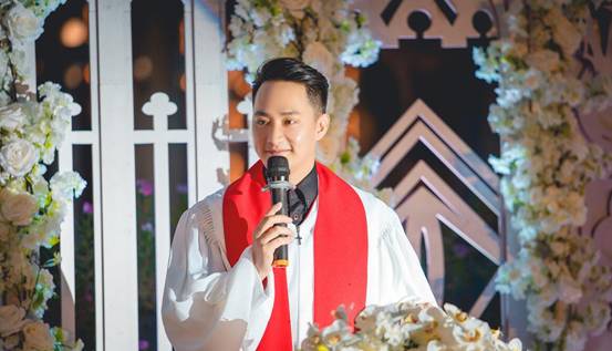 为了打造一场令新人满意的婚礼,在婚礼之前他会陪着新人们一起谈心、彩排,会耐心地指导新人如何走上舞台更加优雅,在镜头面前什么样的角度更加好看。