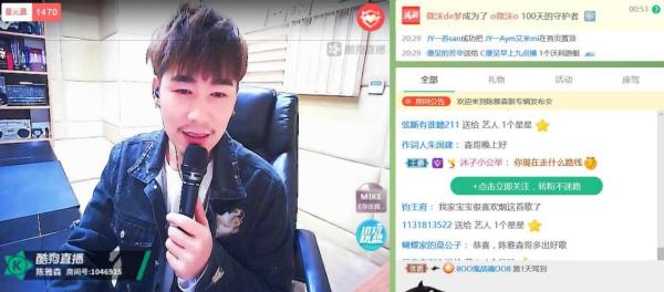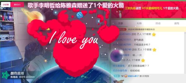 当晚除了师弟金久哲来捧场外,陈雅森的大徒弟李明哲也在两枚爱的火箭的“伴奏”下登场,为老师加油打气。陈雅森坦言,李明哲是个很不错的歌手,下面也会有和他一起合唱的单曲发行。而且,李明哲马上也会在酷狗直播平台做直播的,希望到时候大家也能多多支持。之后,陈雅森还唱了一曲李明哲的《最后一句我爱你》,让直播间的粉丝们都提前感受了一下他的曲风。
