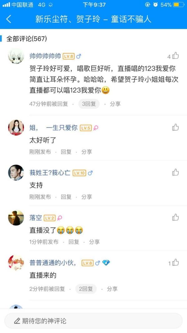 首唱会上,除了《123我爱你》火爆全场外,贺子玲新歌《童话不骗人》也颇受欢迎。这首歌当天刚刚新鲜出炉,可以说,第一次现场演唱就诞生在酷狗直播了。耳边聆听着贺子玲甜美的歌声,粉丝们的手指也没停下来,一次性50张、100张的刷起了这首歌的数字专辑。而《童话不骗人》在酷狗音乐的评论也直接逼近999+,大多数粉丝称都是边看直播边搜索过来的,并给这首新歌热情打电话。此处划重点,要想推新歌,记得来酷狗直播首唱会哟~