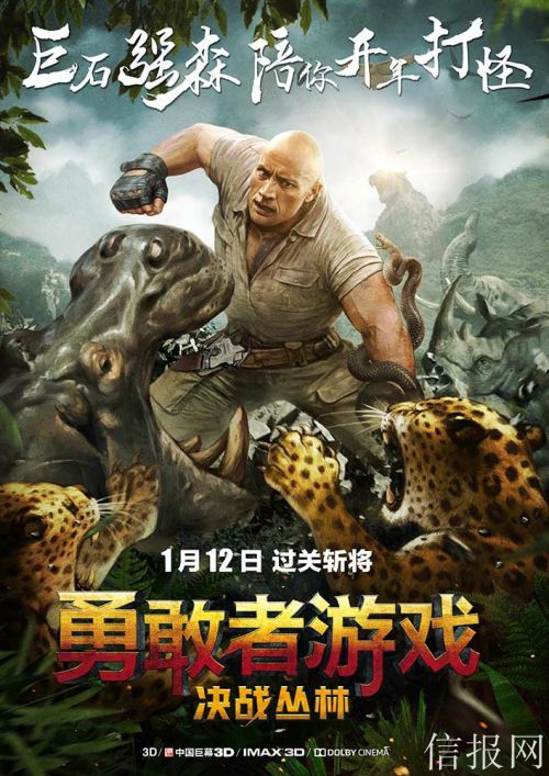 信报讯(记者李严)随着上映日期的临近,由索尼哥伦比亚影片公司出品的好莱坞动作冒险巨制《勇敢者游戏:决战丛林》,近日动作不断。继日前曝光“通关打怪”预告之后,今日(昨天),片方再度放出“组团开黑”预告,以及巨石强森来华海报。同时,片方确认,巨石强森将于近期来华宣传,为影片国内1月12日的上映呐喊助威。