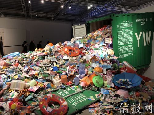 一集装箱的小商品堆集如山散落在地面,这就是这件作品最初始的观感。在这个名叫《义乌调查》中,艺术家将大型红色集装箱的一头嵌入画廊墙上,在集装箱的开口处将他从义乌买来的精果色小商品倾倒而出。刘建华展示的货柜中承载的收获成果充分证明了中国在国际市场中的有力角色及出口的使命。