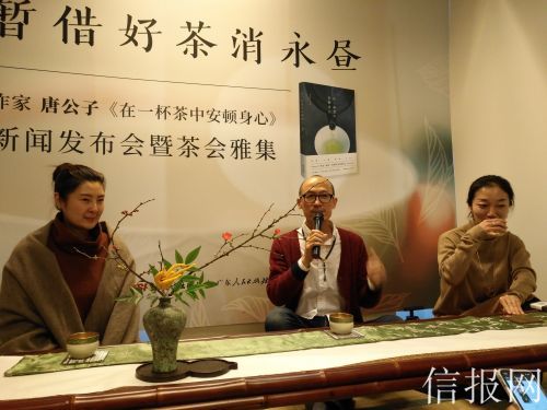12月14日,知名作家唐公子携其新书《在一杯茶中安顿身心》在京亮相。据悉,当天活动以“暂借好茶消永昼”为主题,汇集了国内宣德炉第一藏家刘锡荣、当代著名设计师宋涛、电影《77天》制片人佟蔓薇、奥运体操冠军邢傲伟、87版电视剧《红楼梦》晴雯扮演者安雯、作家安意如等各界文化大咖因茶而聚。当代著名琴人行者还现场抚琴,为在场读者营造出“世外桃源”之感。